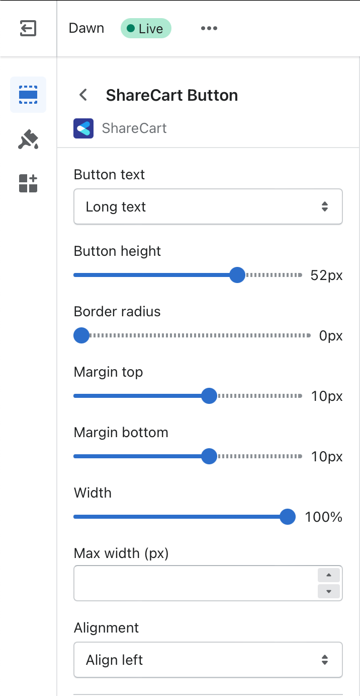 Note: If the in-built customization options are not enough, in special circumstances, we may be able to customize the design of the ShareCart button to your store. Please get in touch with us at support@sharecart.app to discuss further.